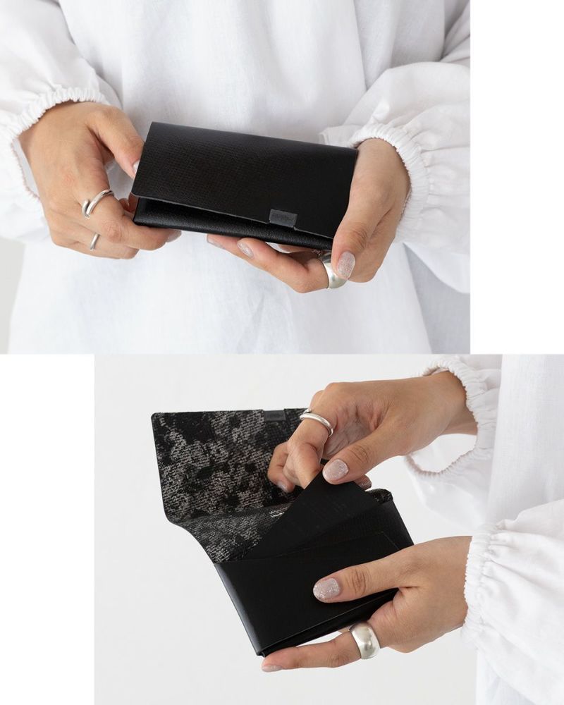 日本で古くから伝わる、贈り物や金品を和紙で包んで手渡す際の礼法「折形」。紙が折り重なるように一枚革を折り、ネジ一本のみで留めただけのミニマルな仕立てが唯一無二の特徴です。