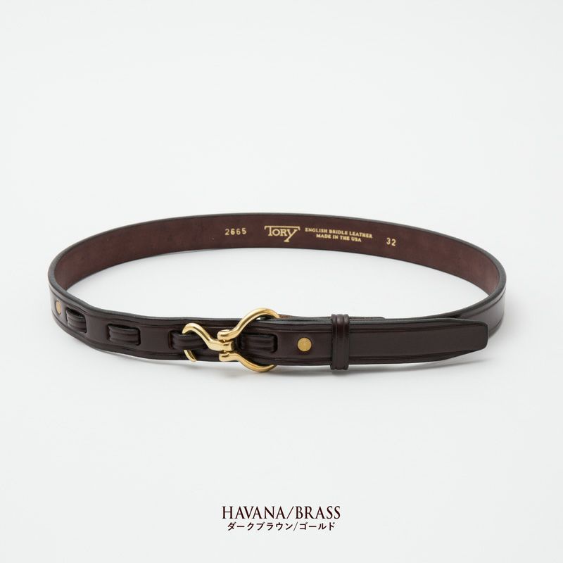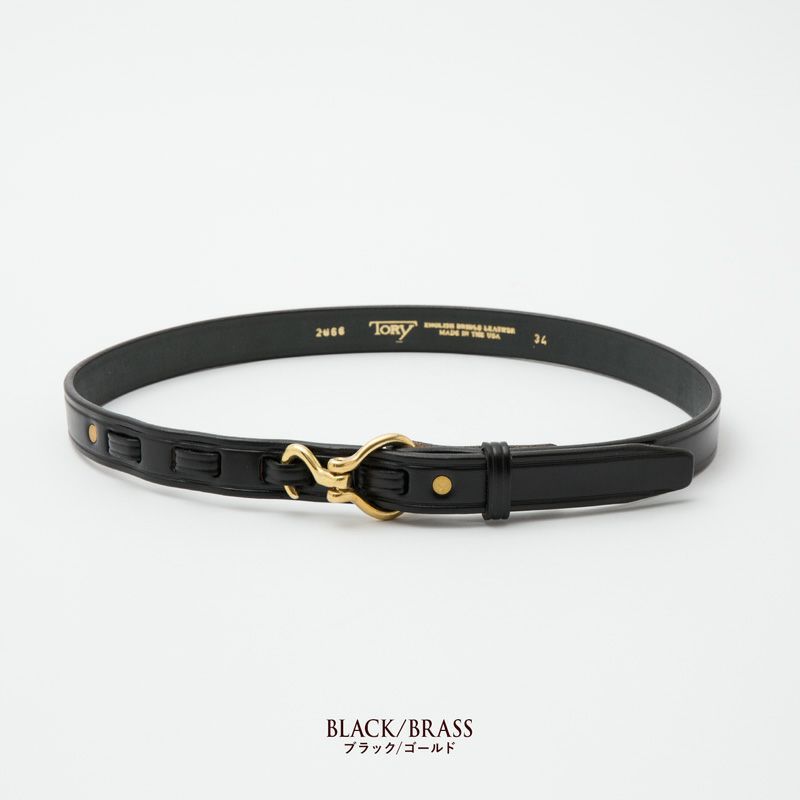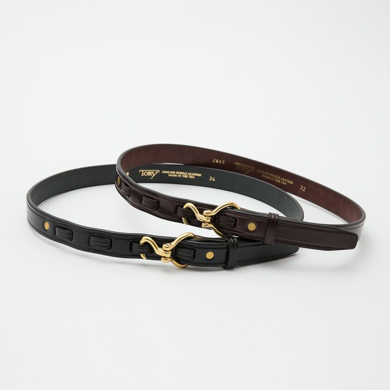 こちらは1インチ(2.5cm)幅で女性にもおすすめな細身のフックバックルベルト。新鮮な見た目でタックインスタイルのアクセントに最適です。使い込んで歳月が経った時に美しい経年変化と丈夫さを実感できる逸品、いかがでしょうか。