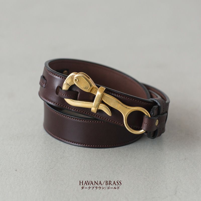 こちらはペリカンの嘴のような可動式バックルが主張するホックピックベルト。使うたびに道具としての魅力を感じ取れるギミック、存在感のある重厚なルックスが魅力です。使い込んで歳月が経った時に美しい経年変化と丈夫さを実感できる逸品。