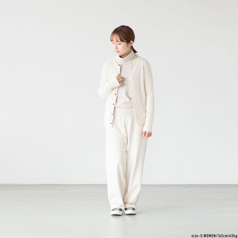 生地感を生かしたクルーネックのカーディガンは、サッと羽織れて万能なベーシックアイテム。