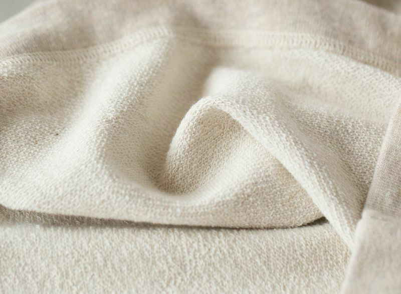 こちらは旧式の吊り編み機を使い、表面をコットン、裏毛のループをシルク100%で編み上げた吊り編みスウェットです。