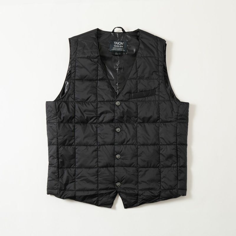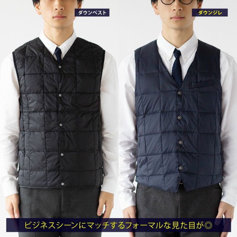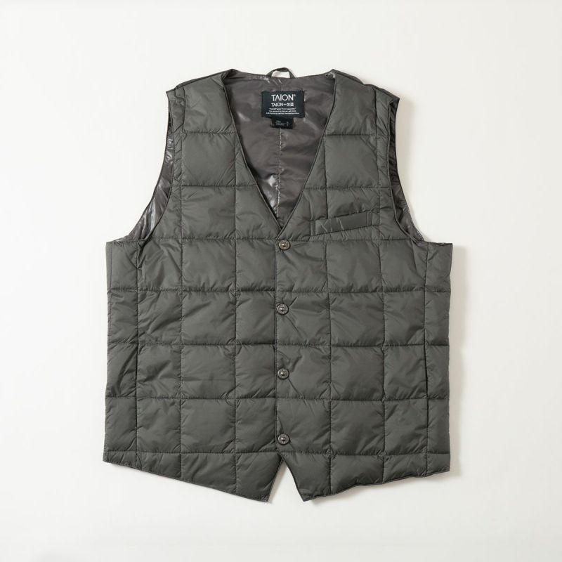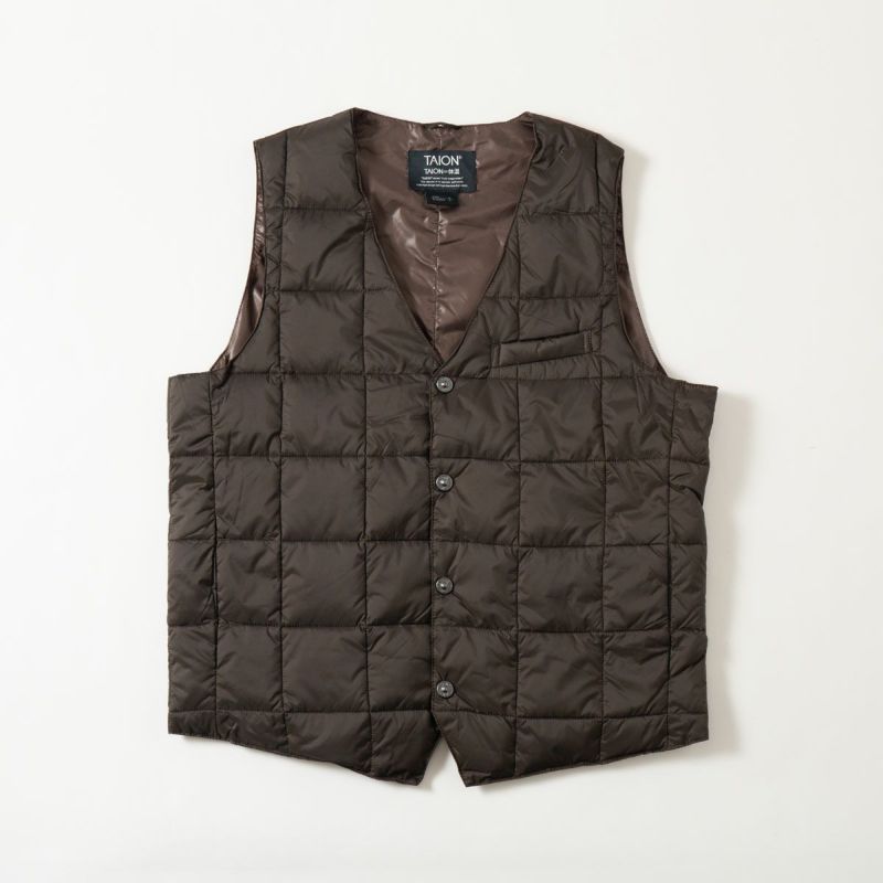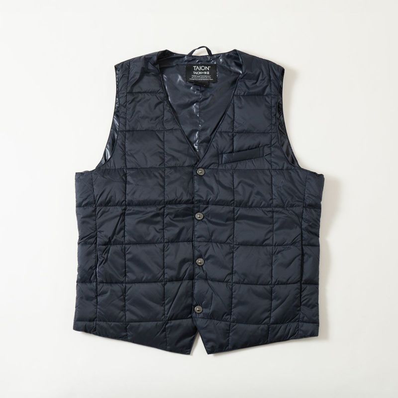 高品質なダウン素材で話題沸騰中のブランド「TAION」。こちらはスナップボタンのついた前開きダウンジレです。