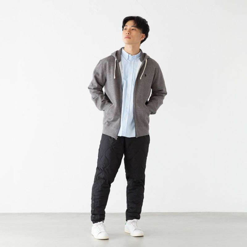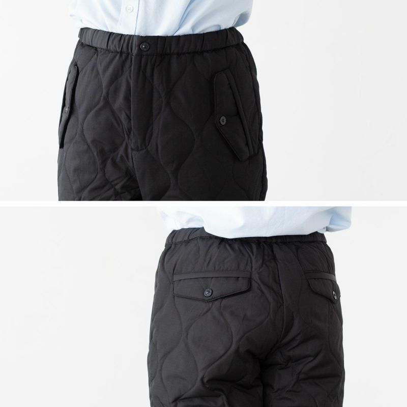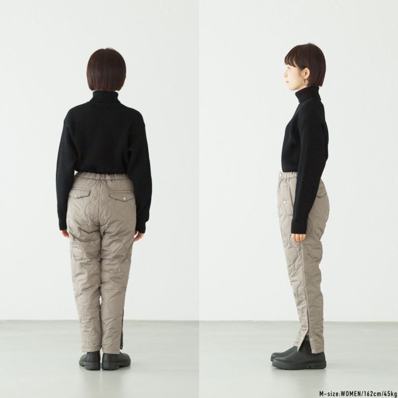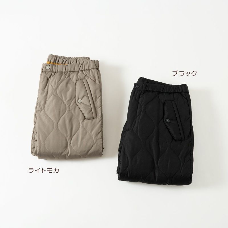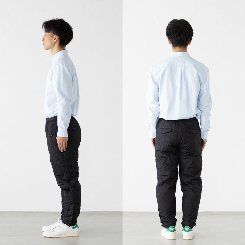 インナーダウンをはじめ、ミリタリーウェアをモチーフにしたアイテムで人気を博す「MILITARY LINE」。こちらは裾のサイドについたボタンスリットが特徴のパラシュートダウンパンツです。