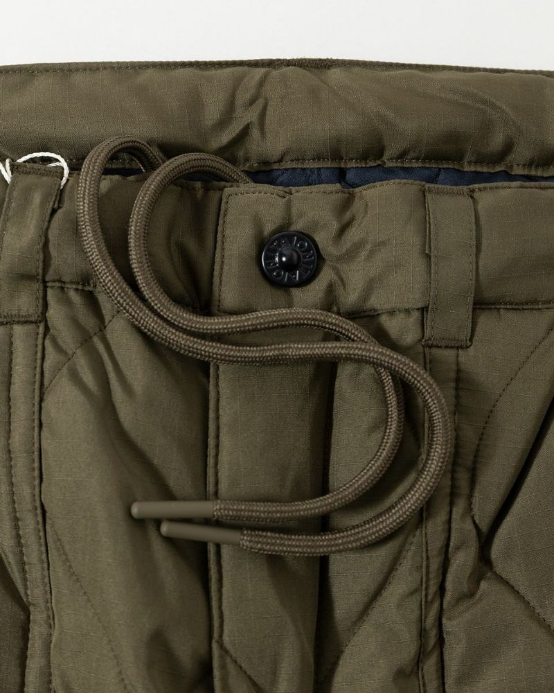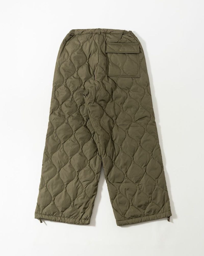 米軍のM65ライナーでお馴染みひょうたんステッチに800FPダウンを封入、ファティーグパンツ仕様のベイカーポケット、裾を絞れるドローコードなどを備えています。