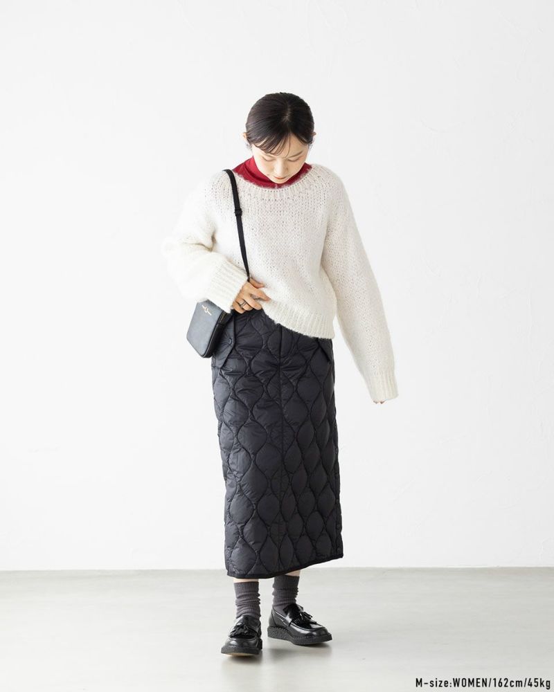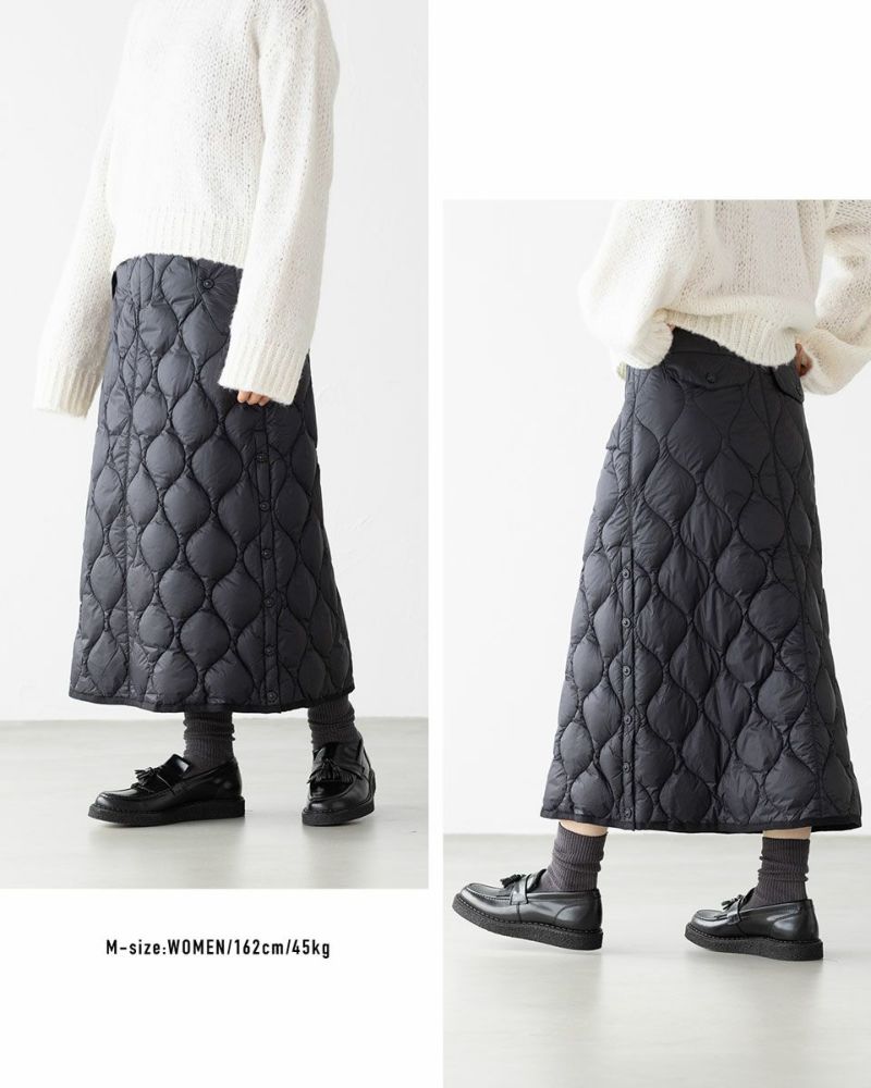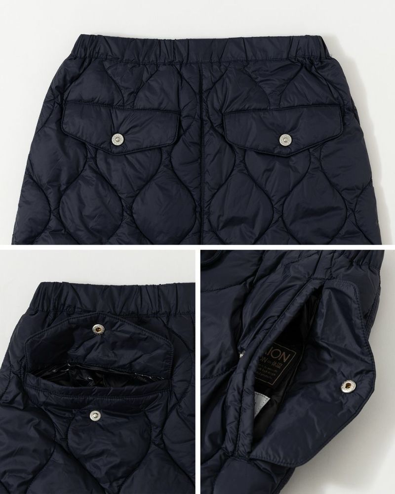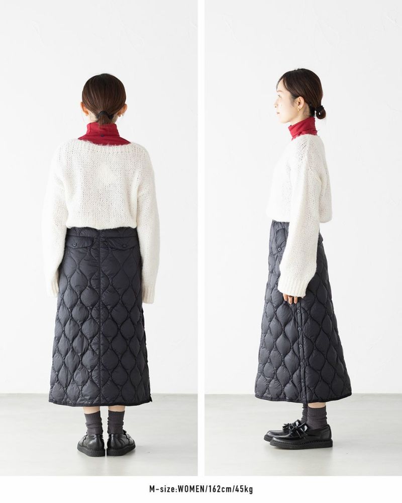 レギンスや細身のパンツとの重ね着もおすすめなミリタリーテイストのダウンスカートです。