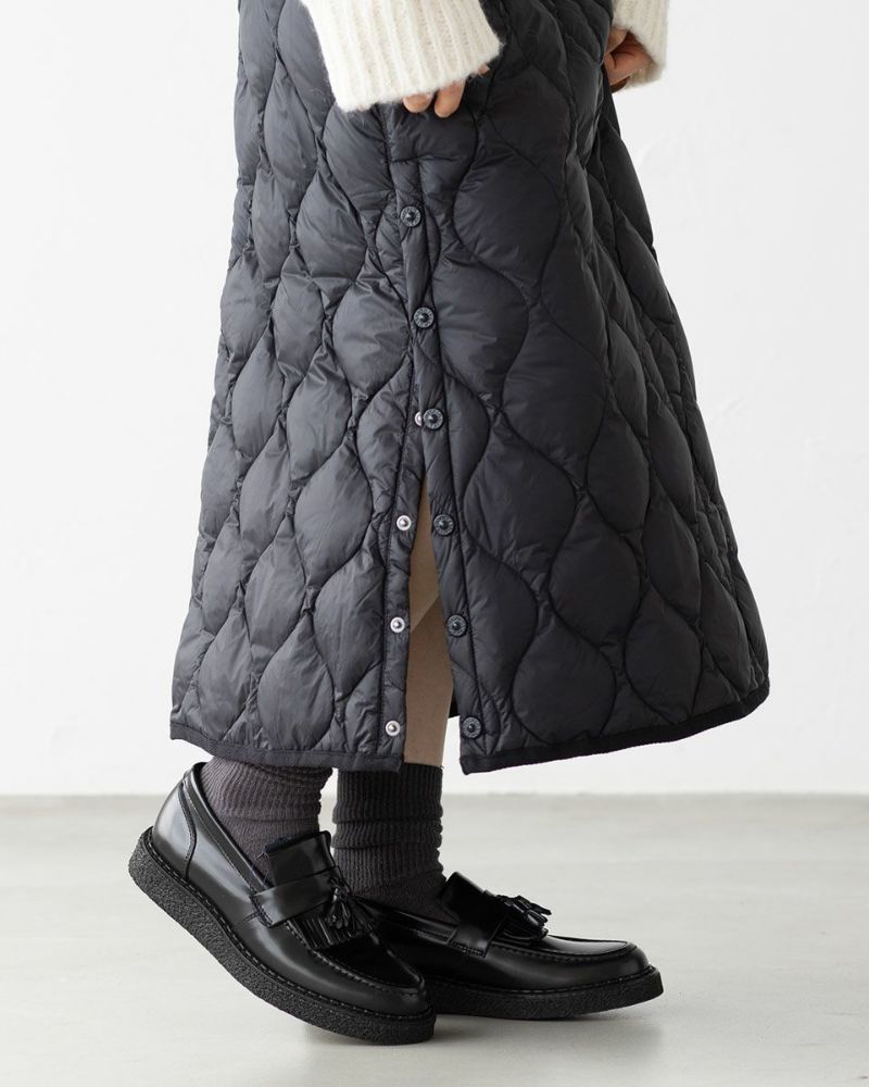 金属ボタンのスリットがアクセント、穿き心地を重視したミリタリーテイストのダウンロングスカート。