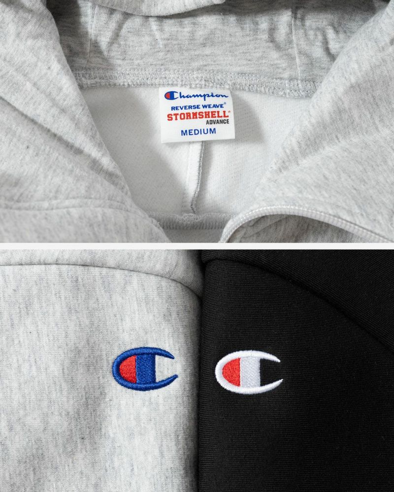 見た目はチャンピオンらしいスウェットながら、防風フィルムを生地の中間層に挟むことでアウトドアシェルジャケットの機能を持たせたストームシェル・ファブリック。