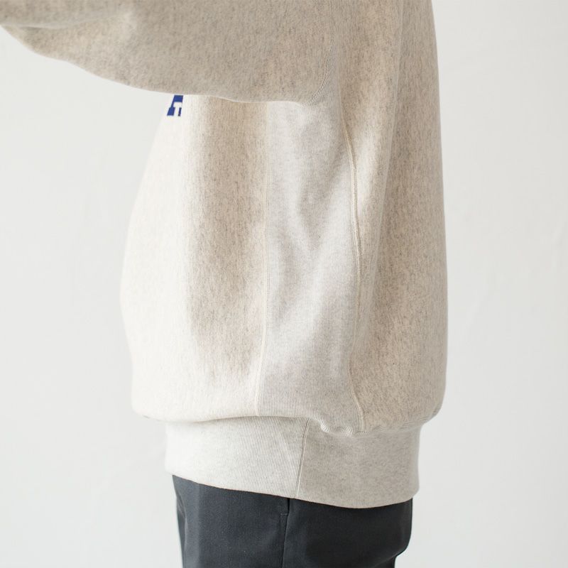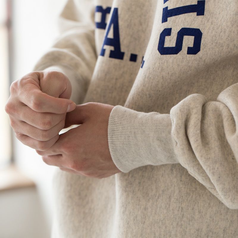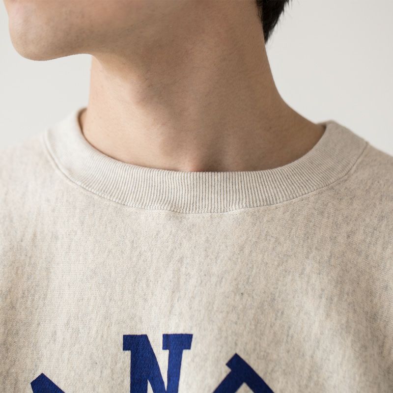 四方をすべて縫い込んだ通称「タタキタグ」も当時のディテールのまま。「REVERSE WEAVE」と「EXPANSION GUSSET」のパテントナンバーを表記した襟ネームも忠実に再現しています。プリントには実在のヴィンテージ商品のデザインを採用。さらに、左袖にCロゴワッペンが付いていない点も当時の仕様そのままです。