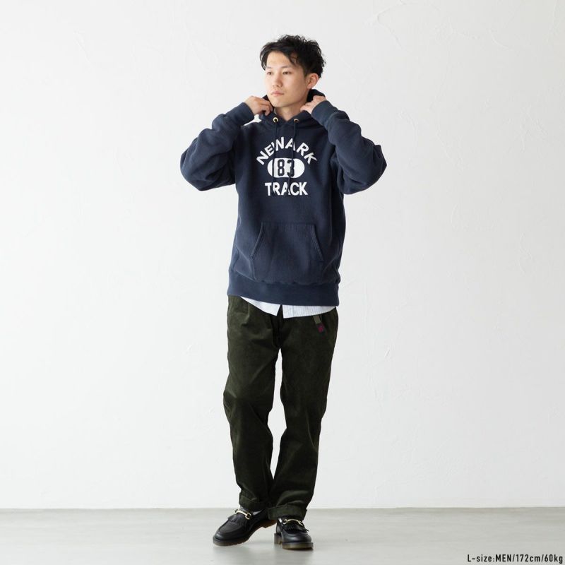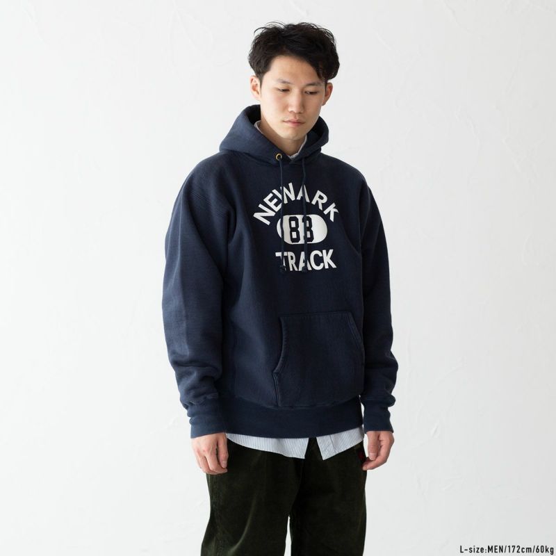 1960年代後期のアメリカ消防法によってコットン100%の裏起毛素材が危険とされていた時代。その時期を経て1970年代に採用されていたアクリル混リバースウィーブ・フーデッドスウェットシャツの復刻モデルです。