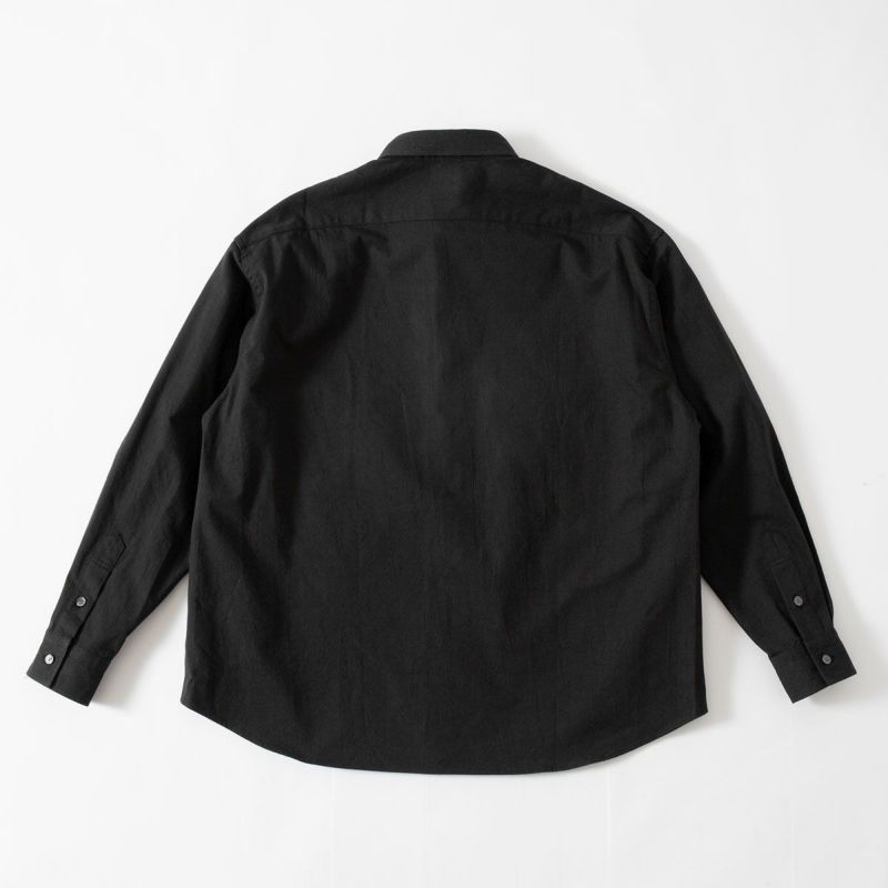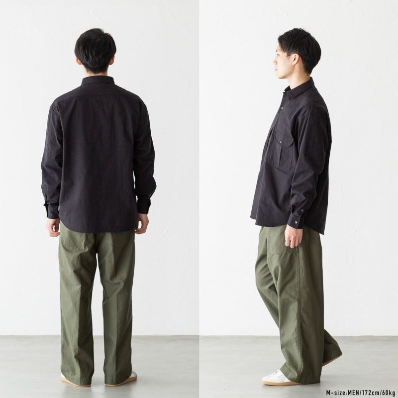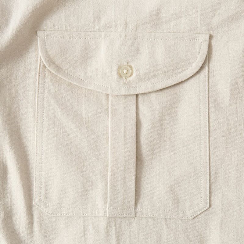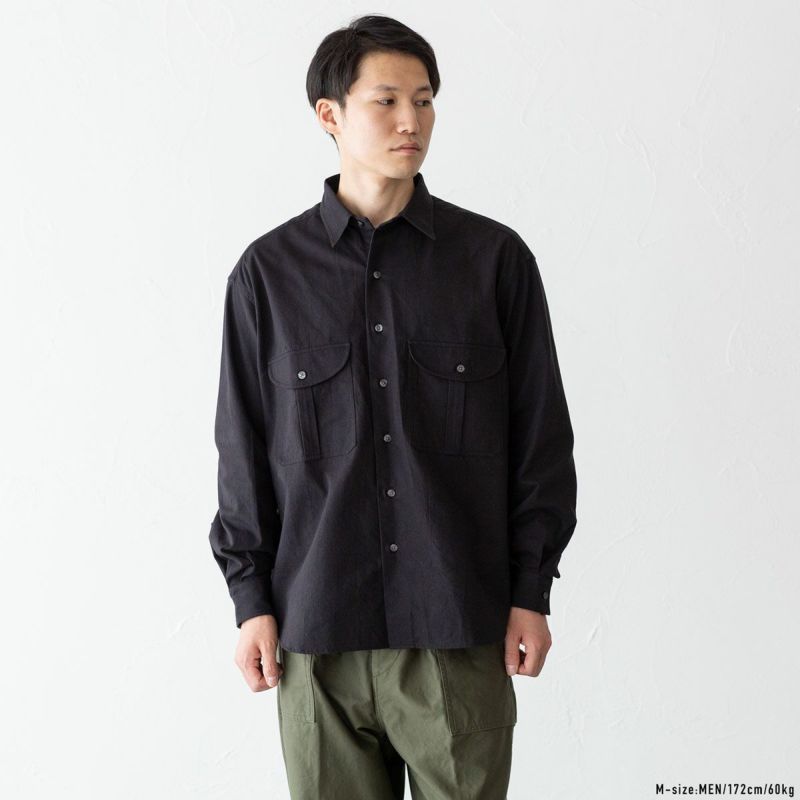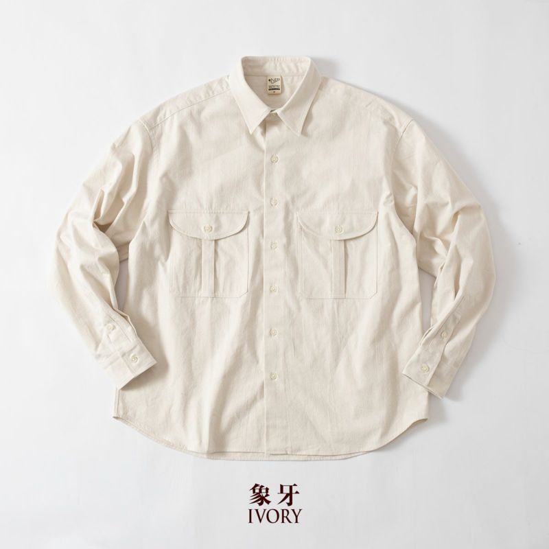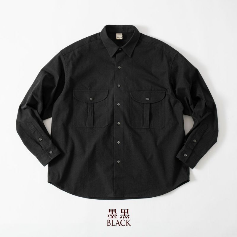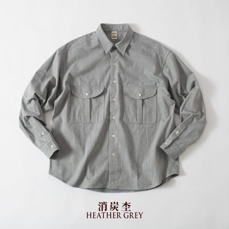ビンテージの風合いを再現した播州織ツイル生地で仕立てたオーバーサイズシャツ。ジャケット感覚で着れるボックスシルエット、胸の大きなフラップポケットがデザインのポイントです。
