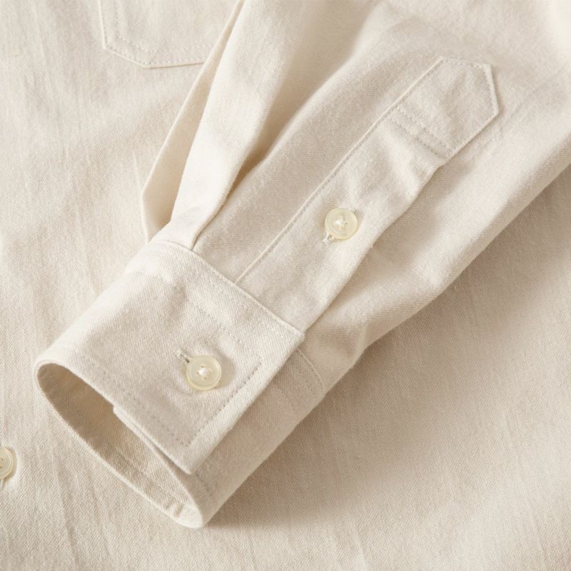ステッチが主張せず、ボタンが引き立つ、すっきりとした印象の裏前立て仕様。ドレスシャツのような上品さを引き出してくれます。