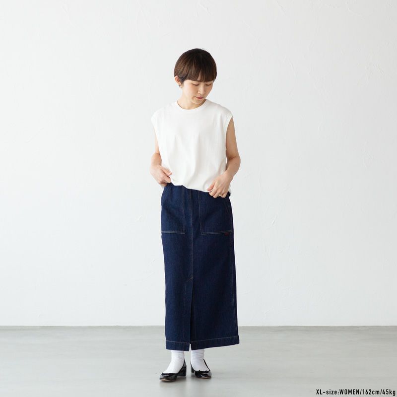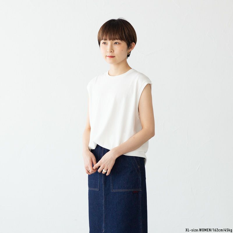 綿から精製されたキュプラがもつ吸湿性・放湿性の高さに着目した、涼感のある吊編みのノースリーブTシャツ。