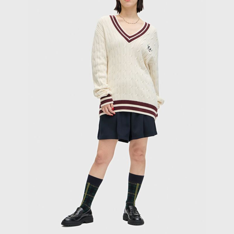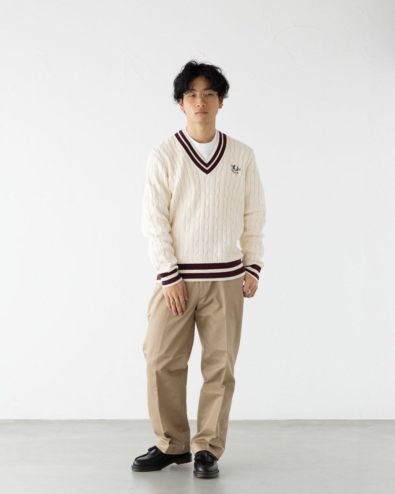 テニスクラブのウェアをイメージしたチルデンセーターで、スポーティーでありながら上品な印象のルックスに仕上げています。