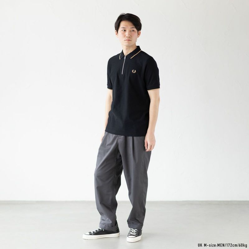フレッドペリーの定番ラインポロをアレンジしたメンズポロシャツ。襟と袖のリブにはシングルラインを取り入れ、前立てをジッパーにすることで存在感がありつつシックな雰囲気に仕上げています。
