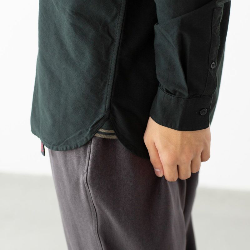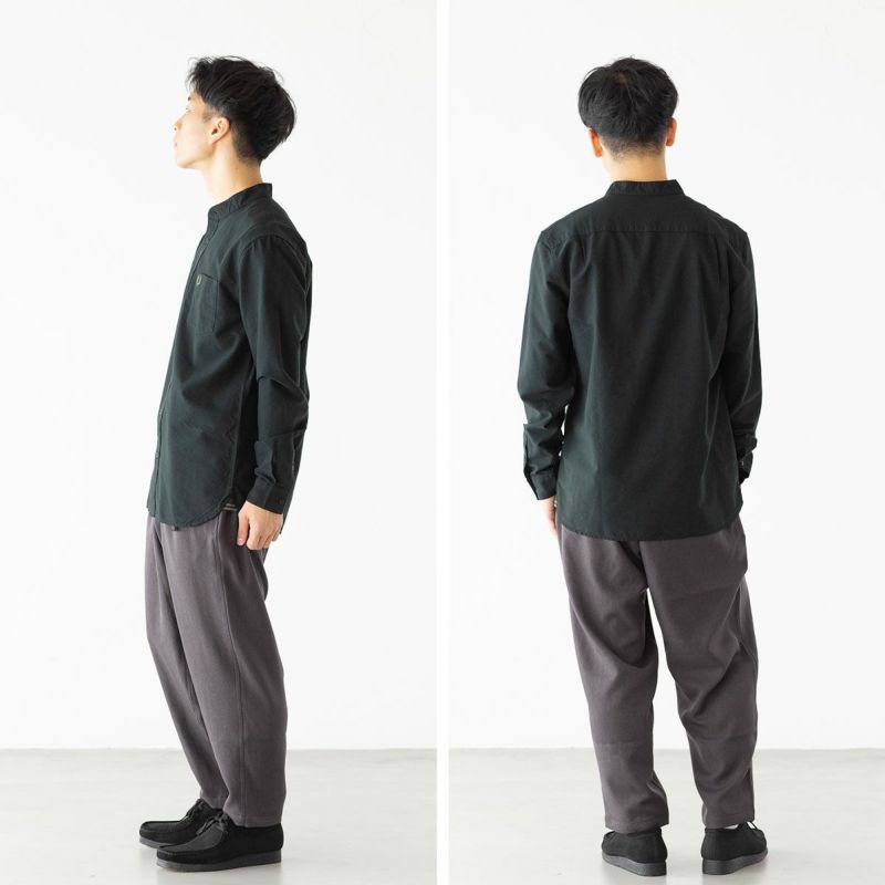 レギュラーカラーのシャツに比べ、首元がすっきりと仕上がるのがポイント。ワークパンツと合わせ適度にカジュアルダウンしたシャツとして合わせるコーデのほか、黒のスラックスと合わせればちょっぴりモードな雰囲気を楽しめます。