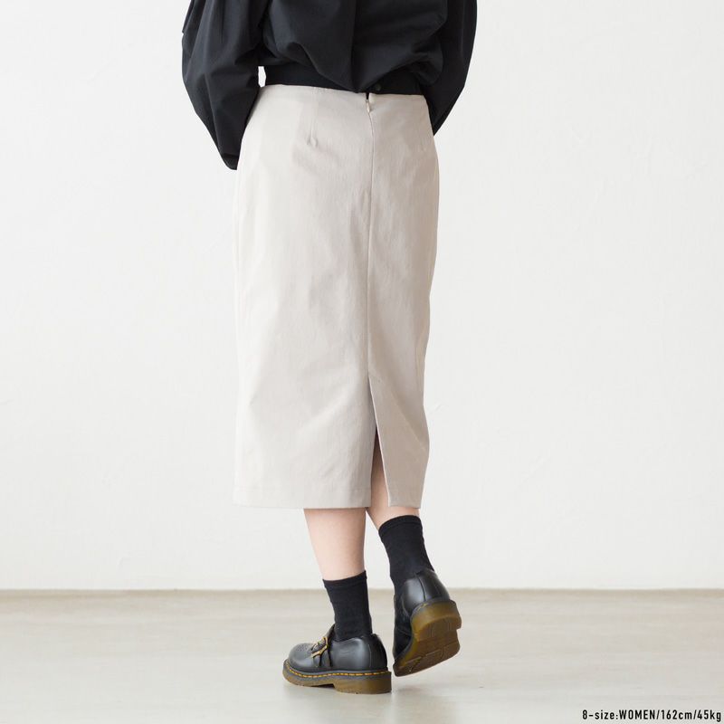 上品な丈感と、旬のニュアンスカラーが魅力のセミタイトスカート。