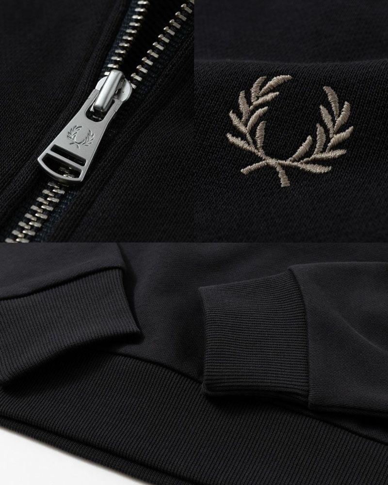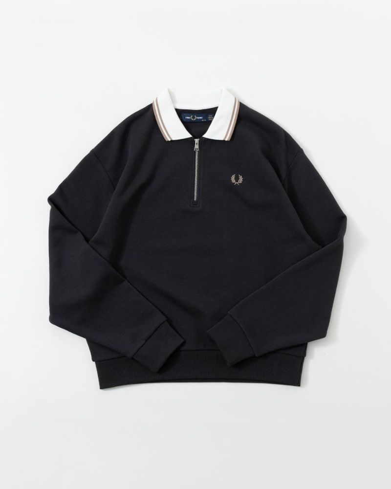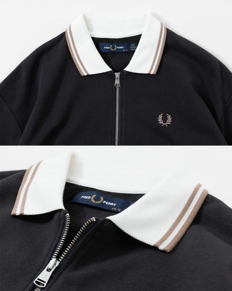 ネック周りのツインティップは刺繍と同色、フレッドペリーらしいアクセントになっています。