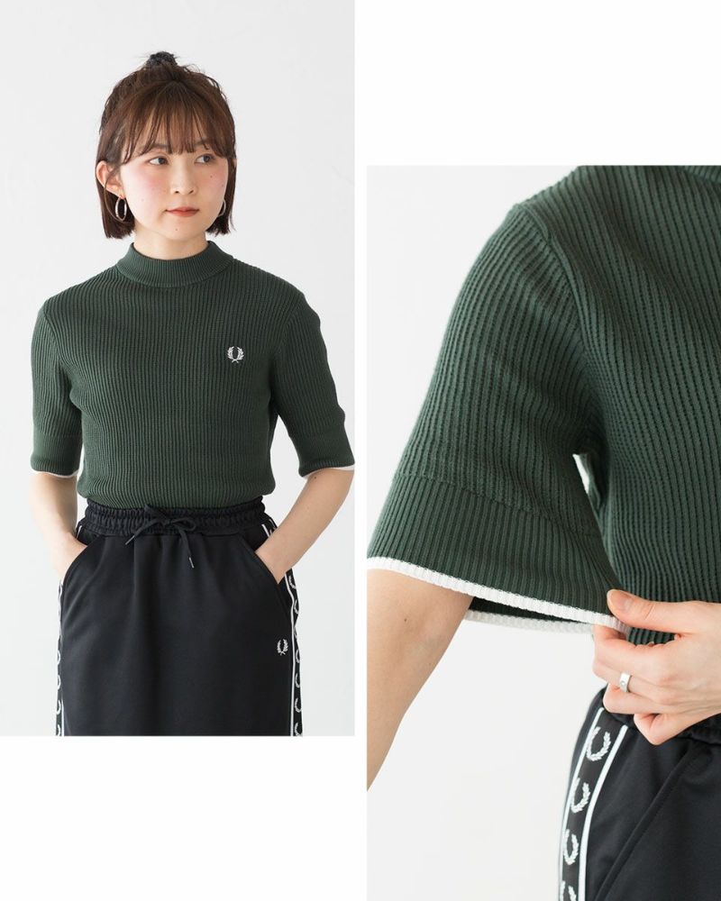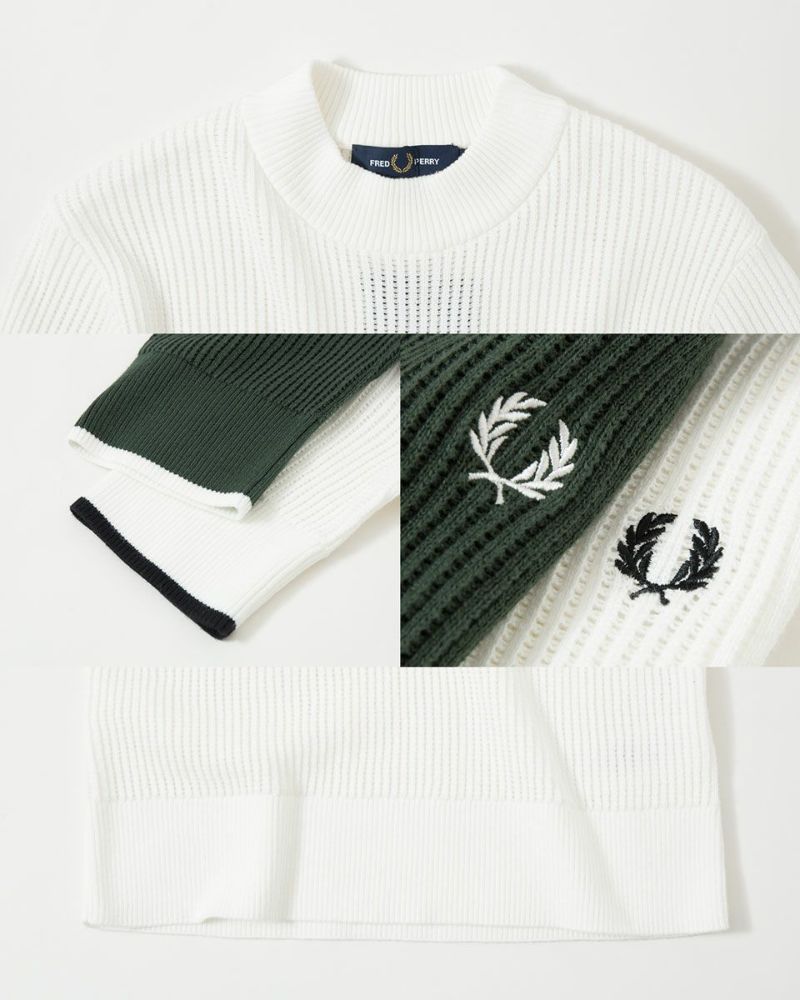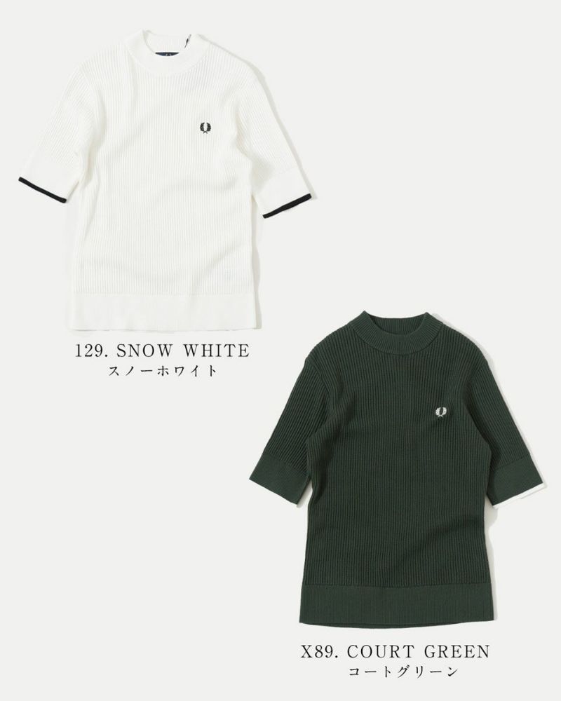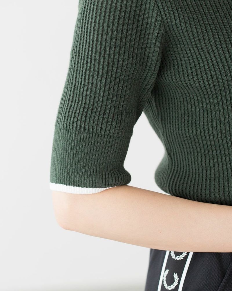 アーカイブのテニスニットからインスパイアされた編地で、ややモックネックで長めの半袖、コントラストの効いたカフのティップラインが特徴です。
