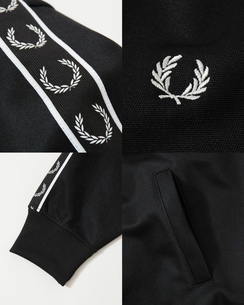 フレッドペリーおなじみのローレルリースが並んだサイドラインテープが特徴的なデザイン。