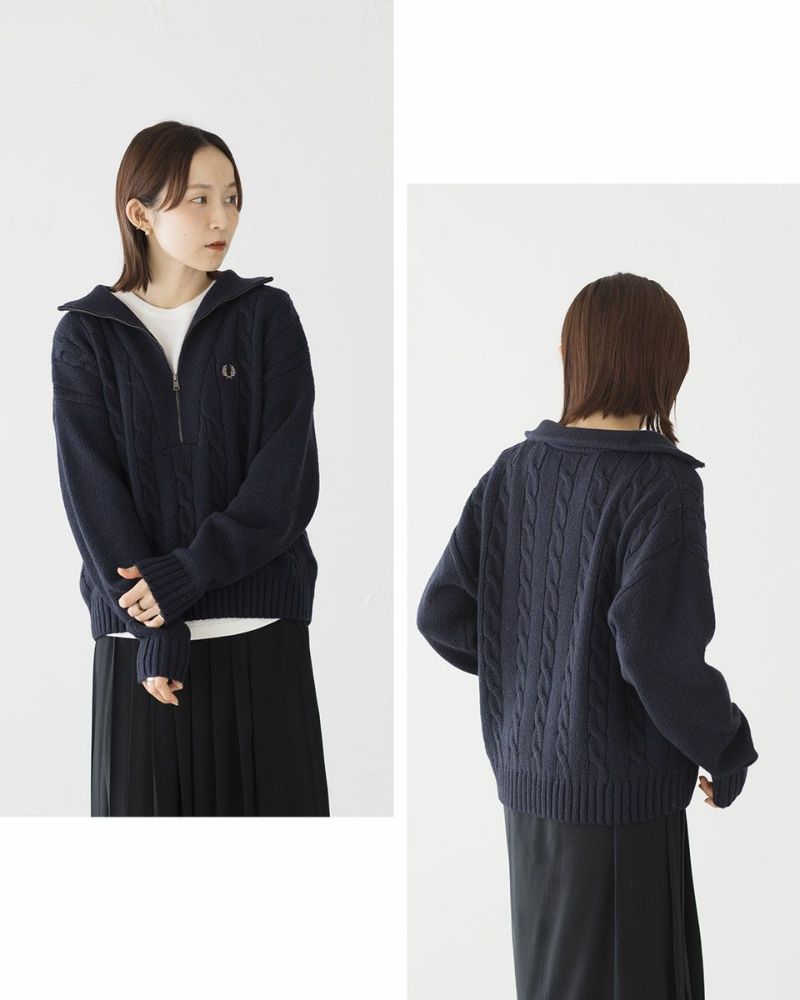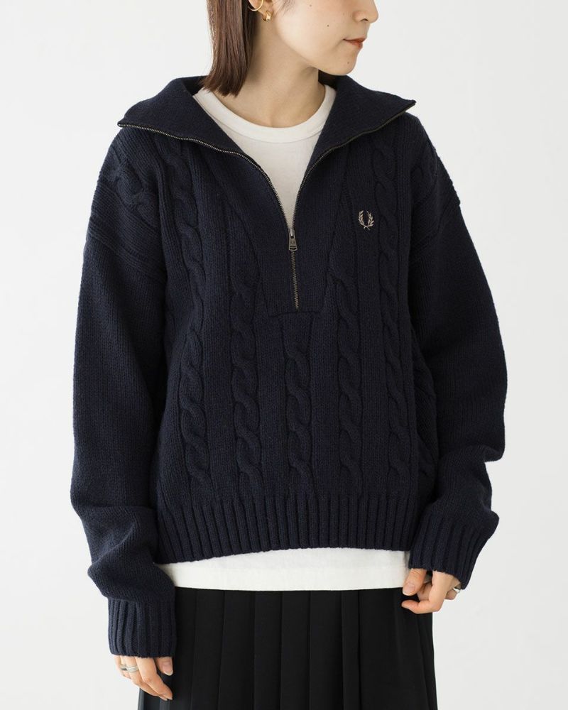 ウールナイロン素材を使用したケーブルニットトップス。英国トラッドの定番アイテムを現代風に再解釈した、フレッドペリーらしいアイテムです。