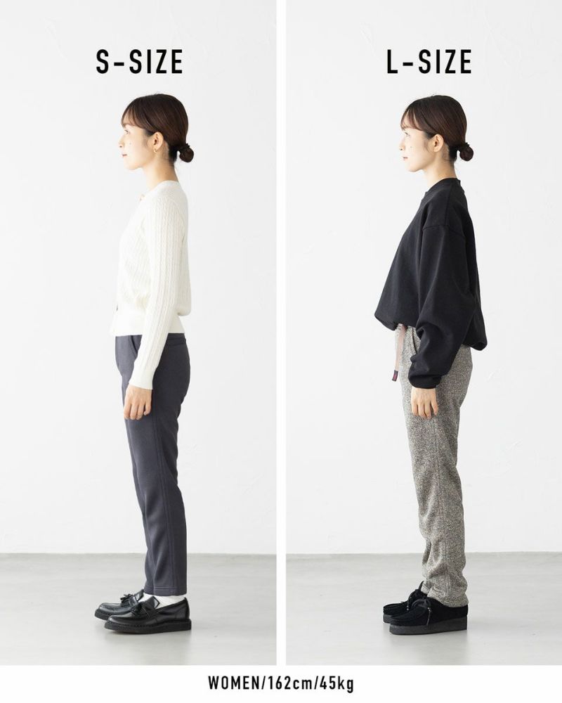 腰まわりや太ももにはゆとりを持たせ、膝から裾にかけて細くなるテーパードラインで、楽ちんなのに全体のシルエットはスッキリ見え。