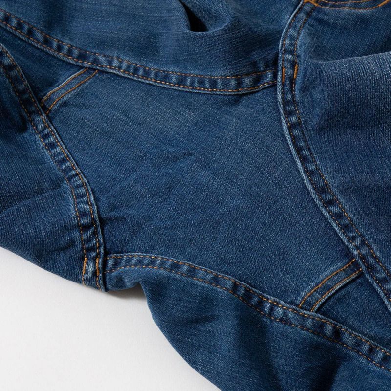 NNデニムパンツよりも少しゆったりとしたシルエット、股下のガゼットクロッチで自然な開脚と足運びの良さを実現しています。
