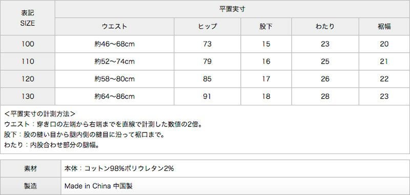 日本サイズ:ウエスト/ヒップ/総丈/股下/わたり/裾幅