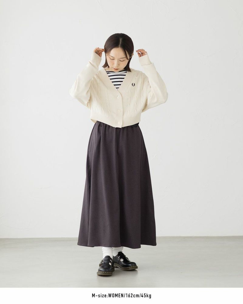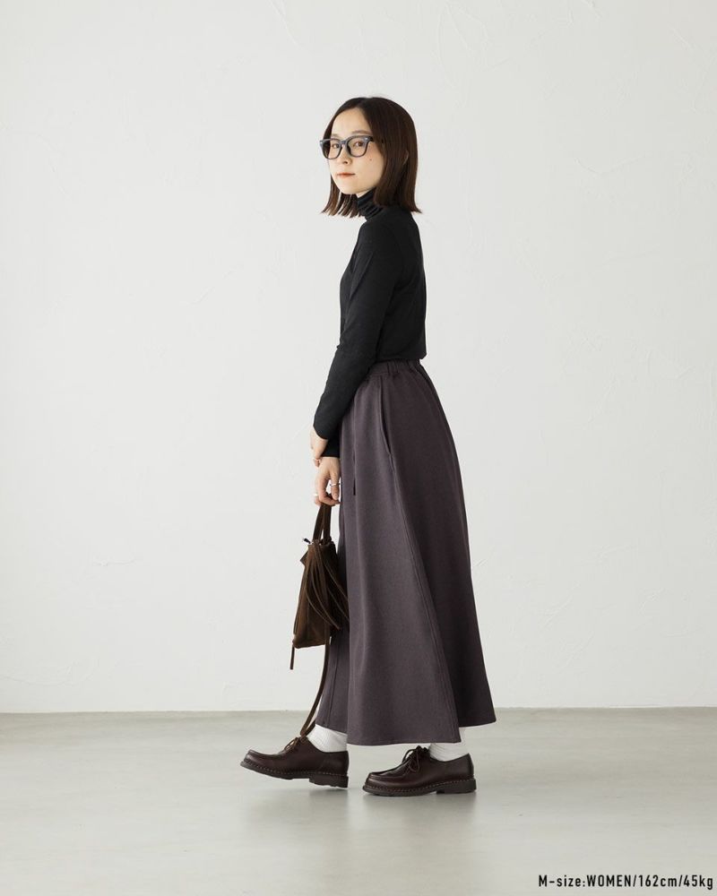 広がりすぎず程よく揺れるフレアシルエットは、動きやすさと女性らしさを両立。ウエストはゴム仕様で、座ったり歩いたりも楽ちんな作り。また、裏地はなくてもチクチク感がなく肌触り抜群、静電気も起きにくいので真冬は厚手のタイツとの重ね着やブーツとの相性も◎。