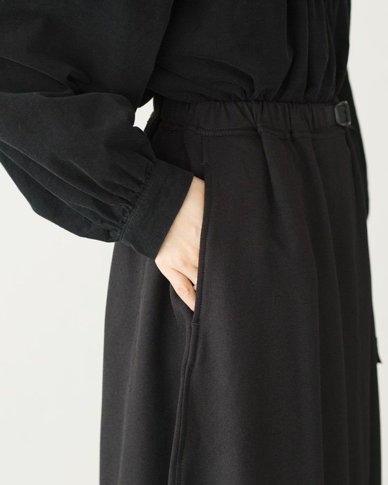 裾にかけて自然に広がるフレアシルエットで、動くたびに軽やかに揺れる柔らかなラインが魅力。広がりすぎず落ち感があるため、トップスを選ばないバランスの取りやすいデザインです。