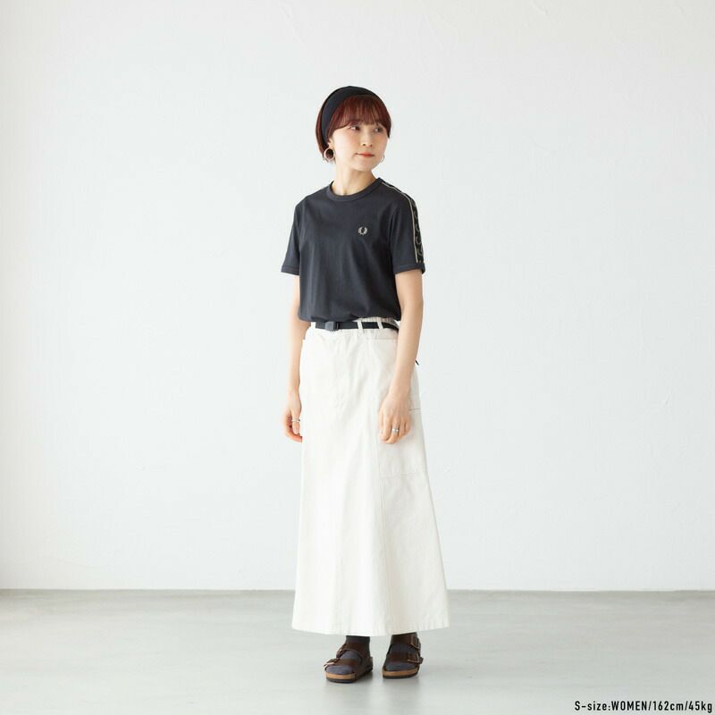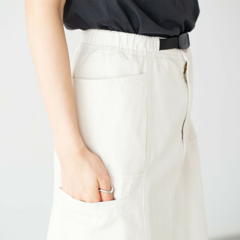 グラミチの新定番「ヴォヤジャーパンツ」のスカート仕様で、両サイドの4つポケットが特徴的。しっかり生地なのに適度に柔らかく、足さばきも◎ロング丈ながらも動きやすいので、スカートが苦手な方にもおすすめしたいカジュアルスカートです◎