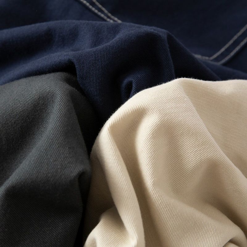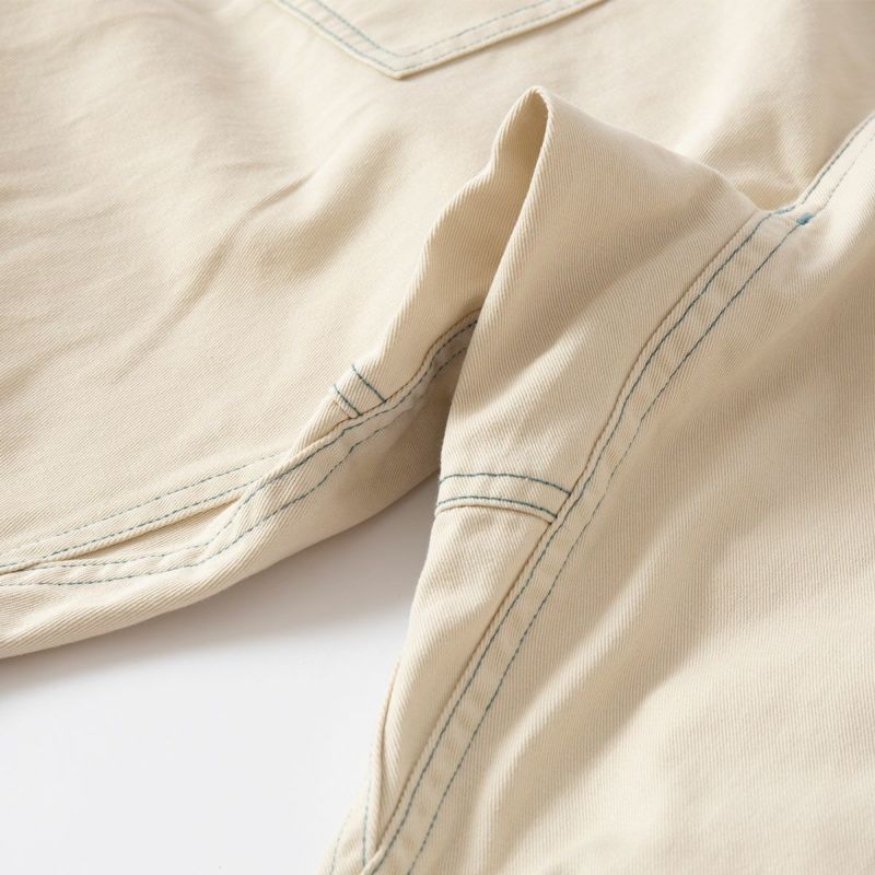 パンツ左右についた大きなポケット、後身頃のパッチポケットも印象的なディテール。 耐久性が高く、ハリコシのある、激しい動きにも耐えるオーガニックコットン使用のコットンツイルを使用しています。