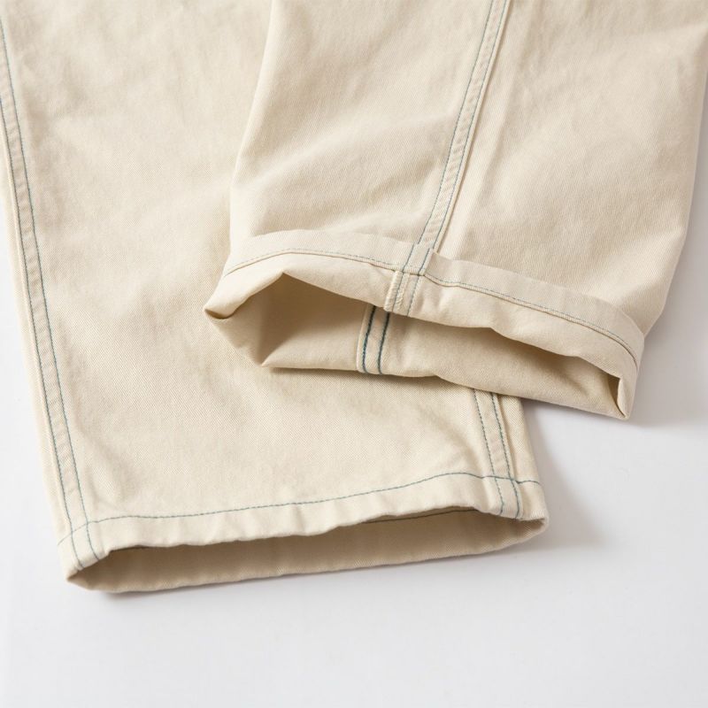 リッジパンツはサイズ毎に股下サイズが調整されているため、くるぶしが隠れる仕様になっています。ワークパンツや後染め古着を彷彿とさせる配色ステッチがポイントです。