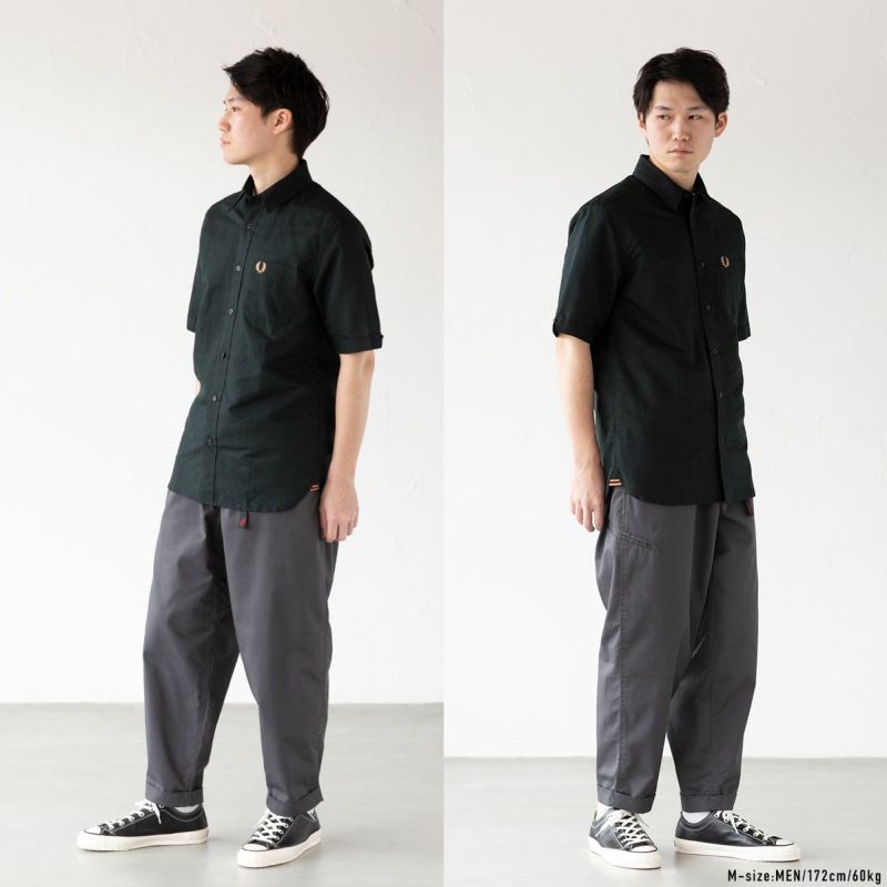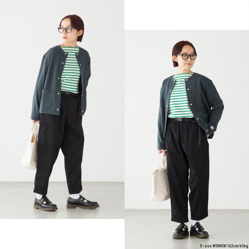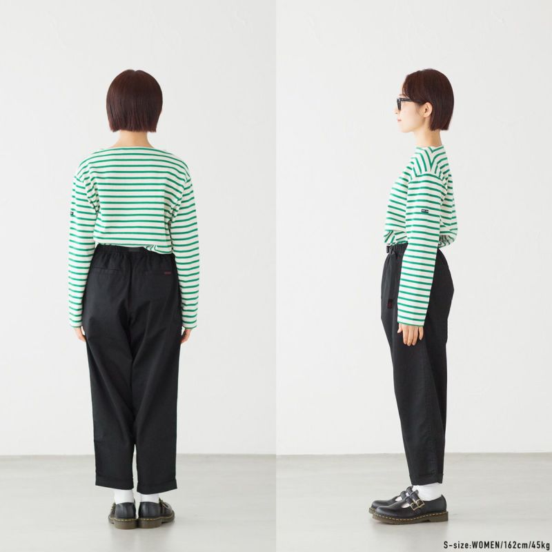 ヒップや腿周りにはゆとりを持たせ、膝から脚先にかけて細くなっているテーパードシルエットのパンツで、定番のテーパードに比べわたりが大きく、よりルーズなルックスに仕上がっています。