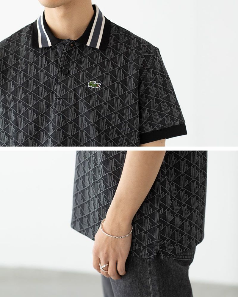 レトロなモノグラム柄が70年代の雰囲気を漂わせるLACOSTEポロシャツ。