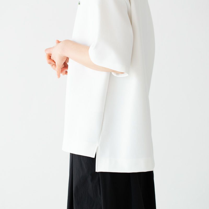 抜け感のあるボートネック&長めの袖丈でカジュアルすぎない印象のデザイン。フロントが短めのゆったりシルエットでバランス◎。