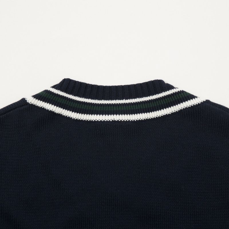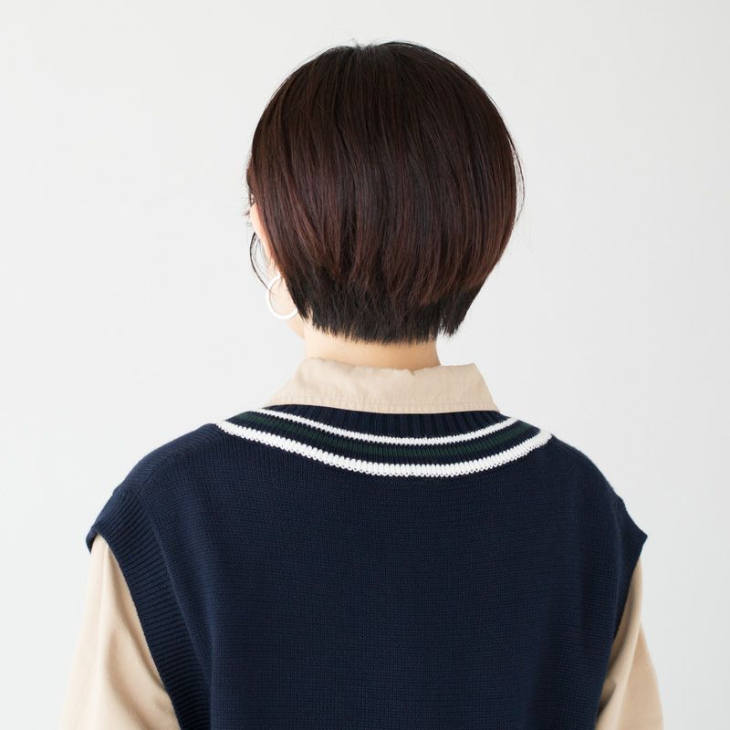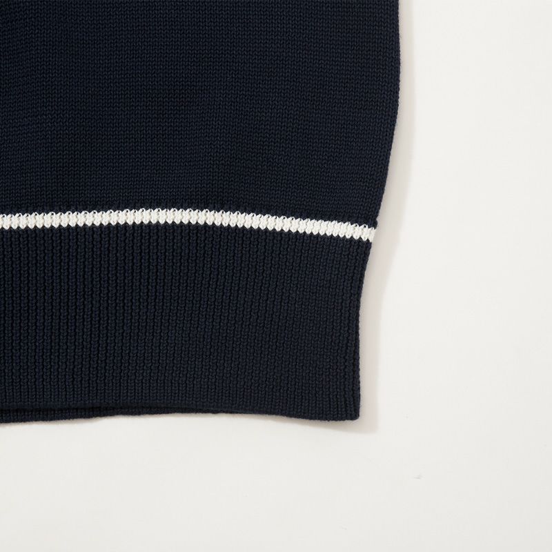 ・ボーダーリブ仕立てのVネックリブを配したチルデンニットデザイン