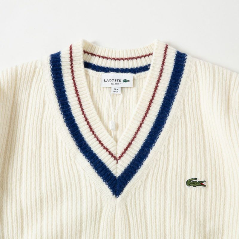 ・プレッピーなスタイルを演出するボーダーリブのVネックデザイン