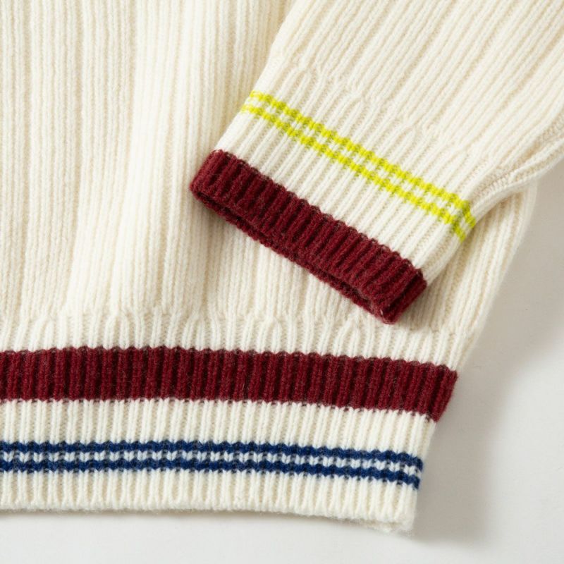 こちらは2色ラインのアクセントが効いたのチルデンセーターです。上質なウールを100%使用しており、最小限の重ね着でも暖かいです。爽やかな印象でありながら、トレンドのリラックスフィットとリブ編みで街着にぴったりな気取らないスタイルに決まります。