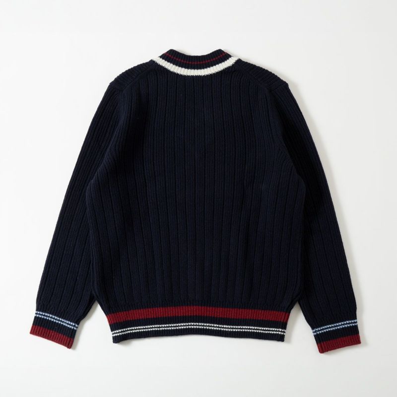 一着でのデザイン性が高いので、チノやベイカーパンツ・シャツと合わせるだけでプレッピーな着こなしの主役に。上からコートやアウターを羽織ってもボーダーデザインがしっかりと主張してくれます。