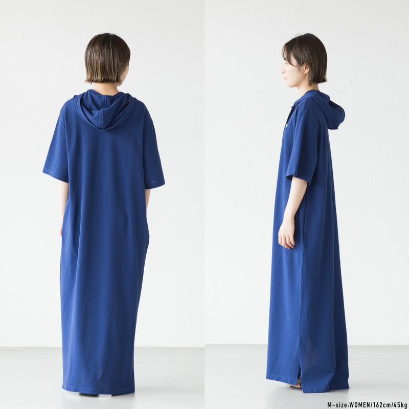 肌触りの良いオーガニックコットンを使用した鹿の子素材のロングワンピース。コバルトブルーの鮮やかなボディに3つボタンのドローストリングス付きフードと着脱可能なカットベルトを装着。カフタンドレスをモチーフにしたシルエットで、春夏シーズンに映える爽やかなモダンフェミニンスタイルを演出します。