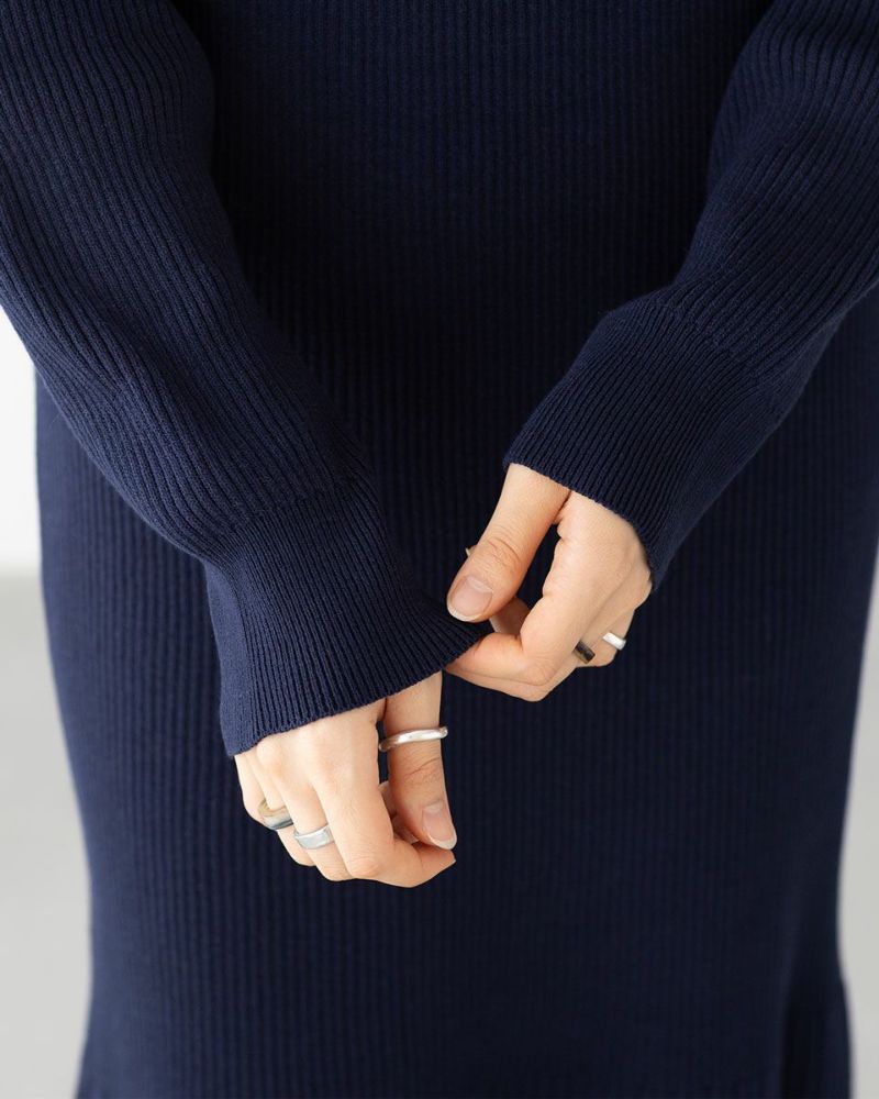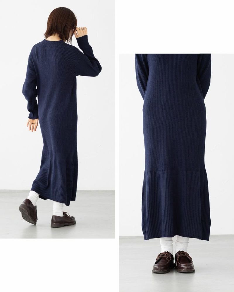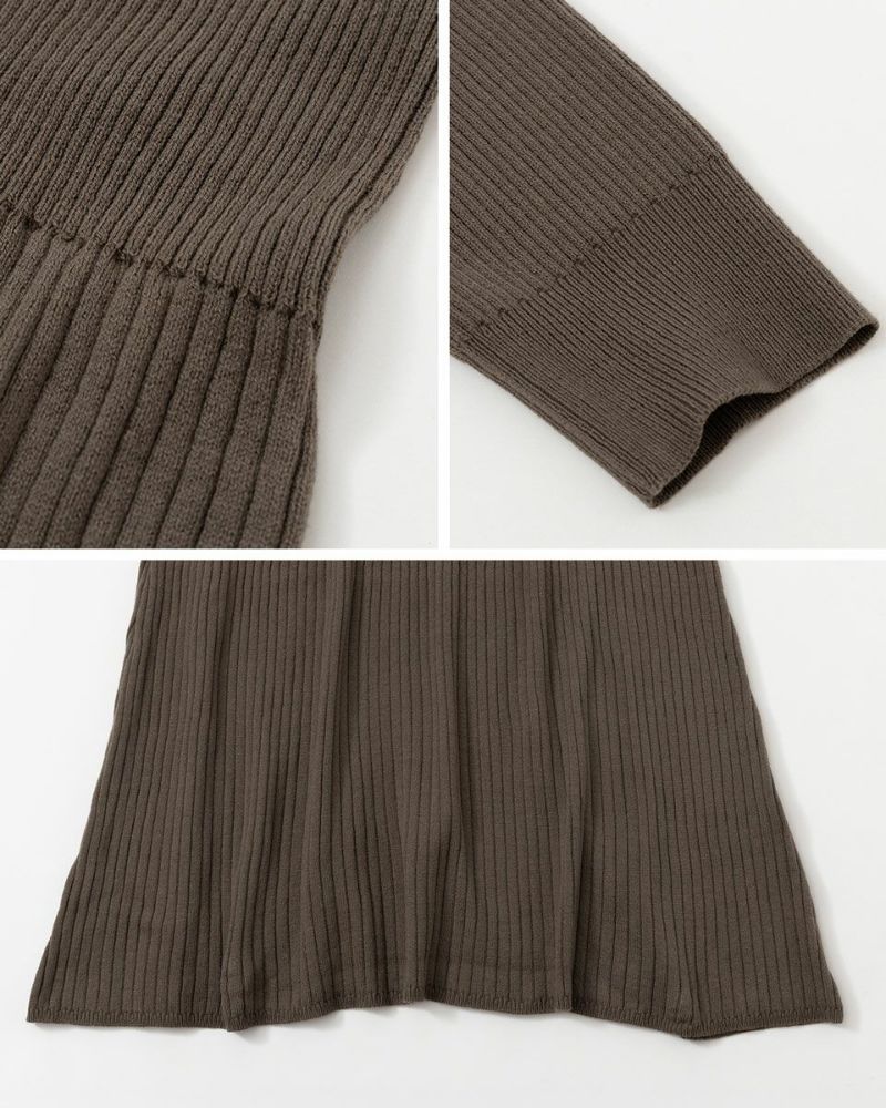 ボトム部は低い位置から幅広リブに切り替えたローウエストスカートのデザイン。甘さを抑えて大人にぴったりの1着に仕上げています。