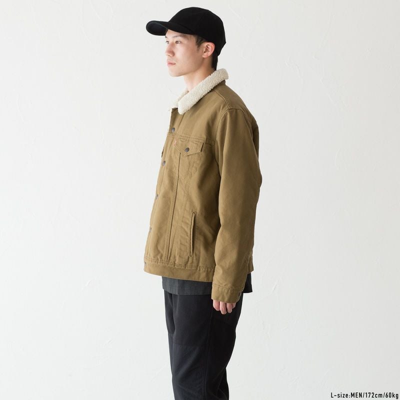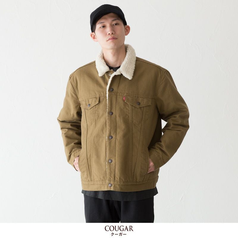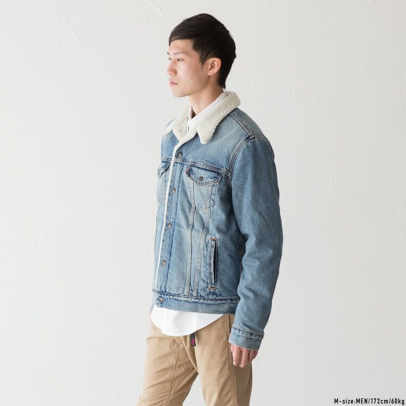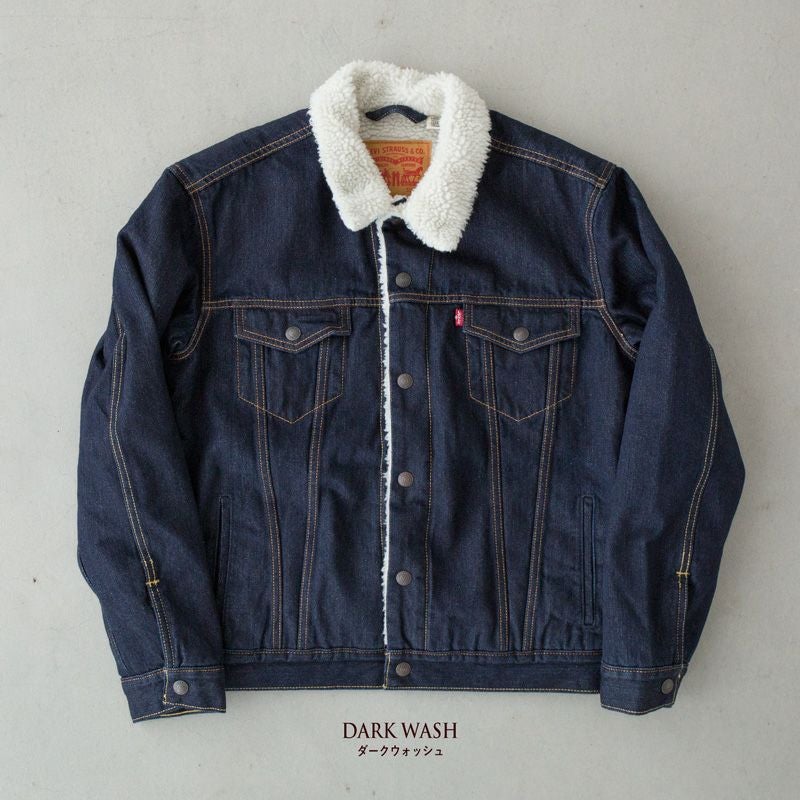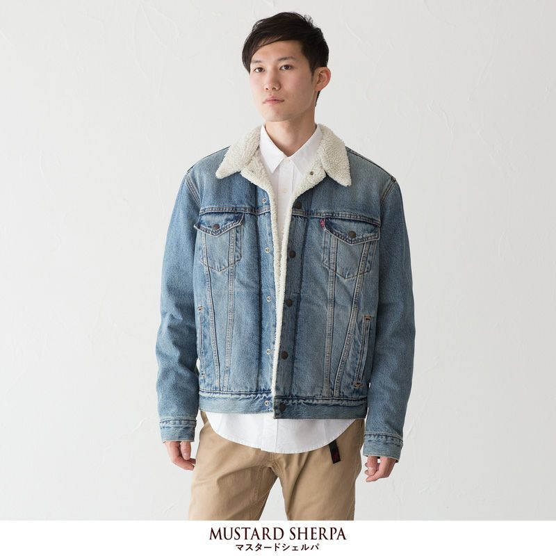 リーバイスの冬の定番、シェルパ・トラッカージャケット。 シェルパとは「ネパールの寒冷な地域に住む少数民族」に由来したネーミング。衿裏と身頃裏に保温性のあるボア、袖裏には中綿キルティングを使い、防寒性を高めたモデルです。