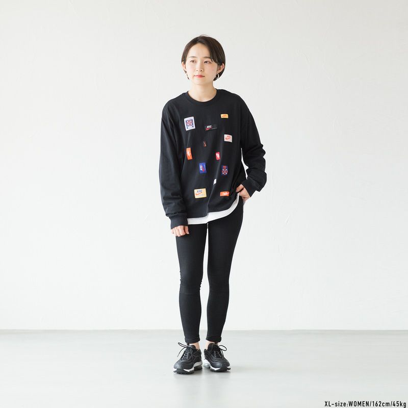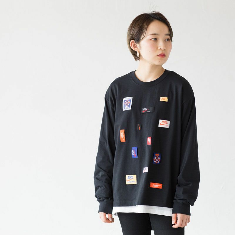 Nikeの歴史を称えるさまざまなウーブンパッチを縫い付けた、ウィメンズの長袖Tシャツ。大きいサイズは男性にもおすすめ(やや着丈が短めです)。ゆったりとした着用感のルーズフィット。