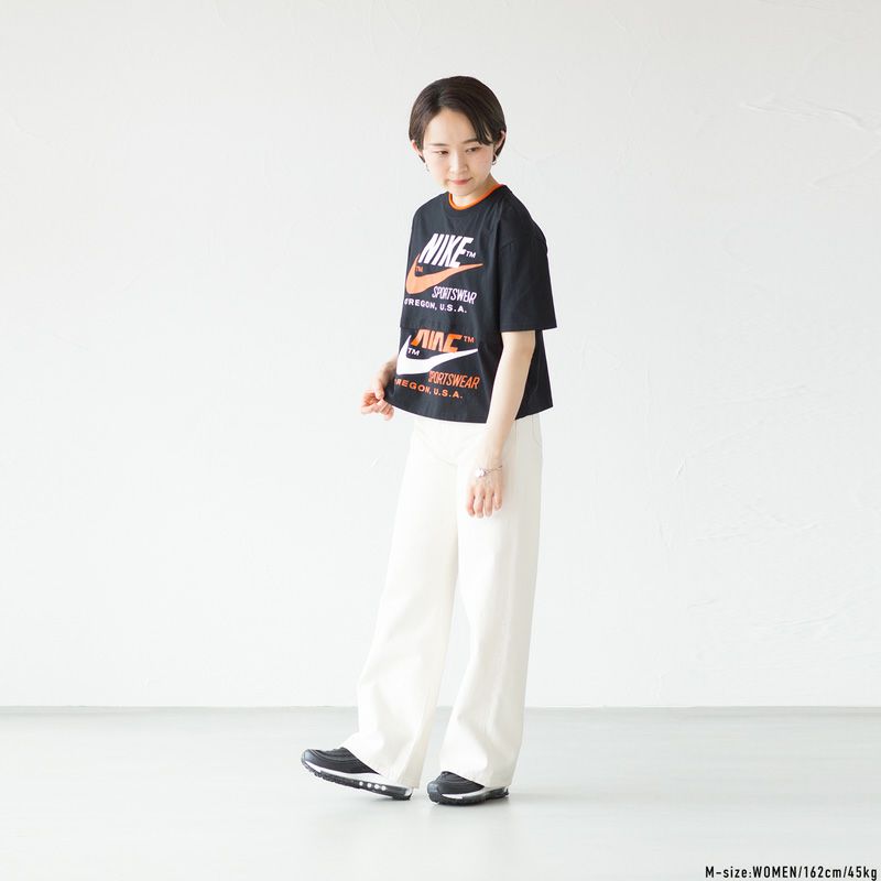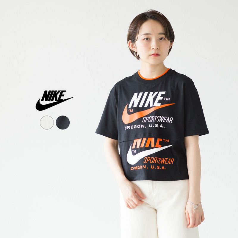 NIKE ロゴを大胆にレイヤードしたショートトップ。