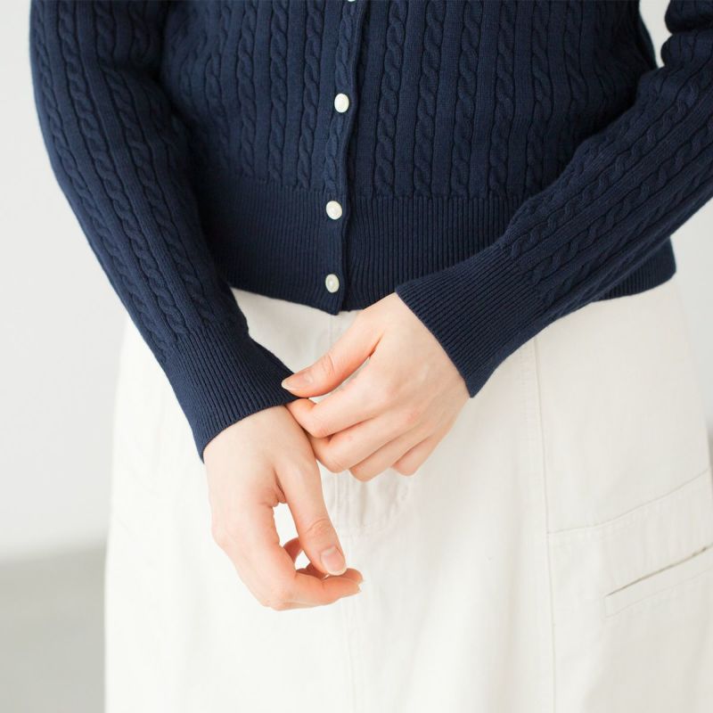 洗濯OK。ケーブル編みのコットンニットカーディガン。