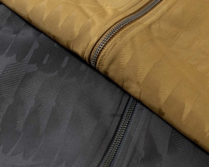 見る角度や光の当たり方により表情を変える、奥行きのある全面グラフィックを施した厚手のウーブン素材。ダブルのメタルジッパーも相まって、ジャージの域を超えた雰囲気たっぷりのジャケットに。