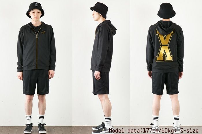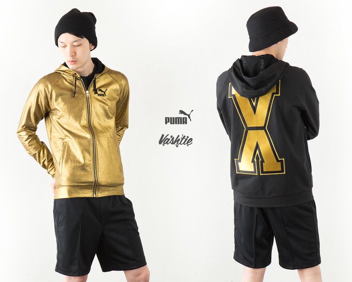 しっかり被れる大きめフード、ドローコードで調節可能。左胸にブラックのPUMAロゴ刺繍。フロントはゴールドファスナーで開閉。サイドにポケット。背中に特大"X"刺繍。