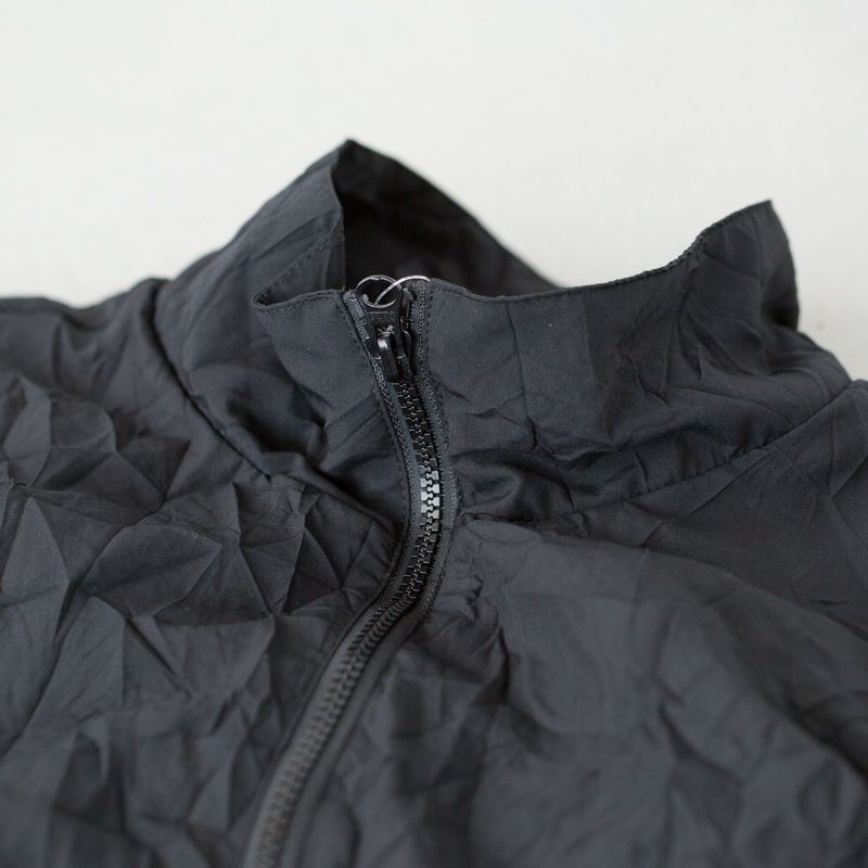 全体にシワ感を施したトラックトップ。風を防ぐ軽量ボリエステル素材を採用し、メッシュの裏地付きでさらりとした快適な着心地。