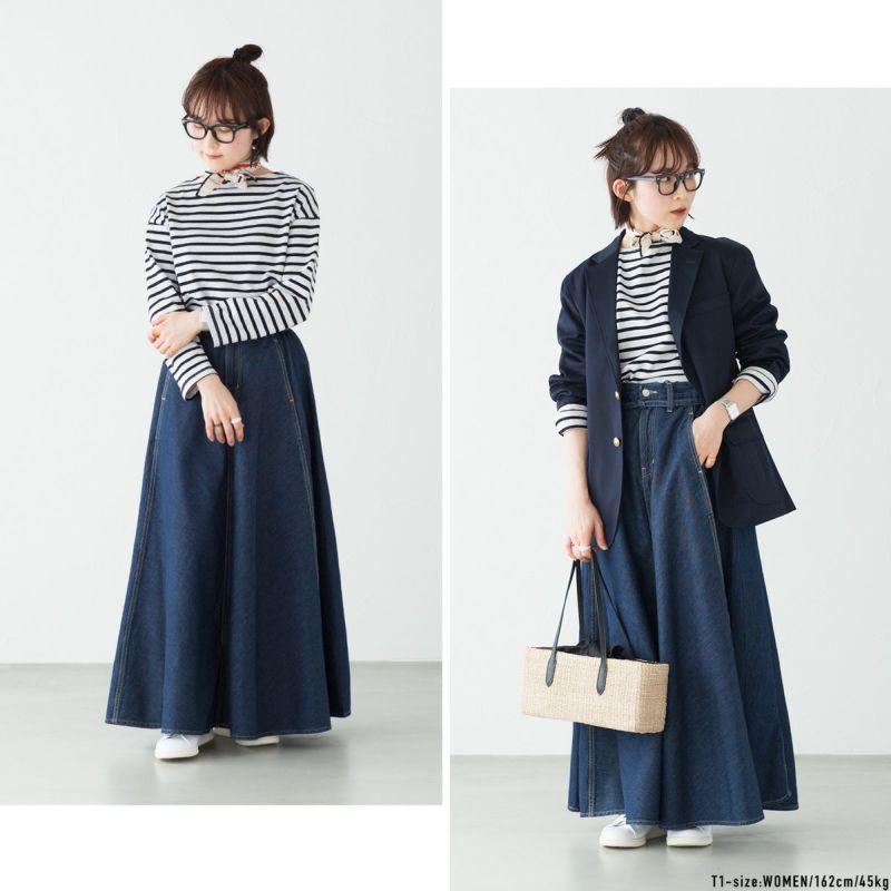 女性向けのT1、T3サイズは着丈が長すぎず、トップスアウトの着方でもバランスが取りやすいデザインです。