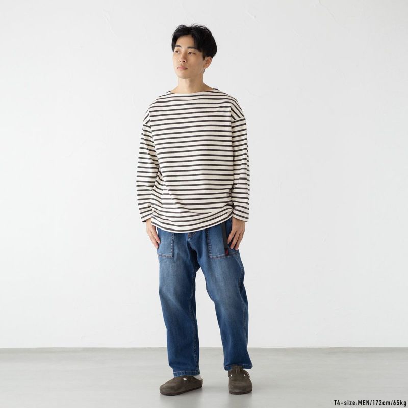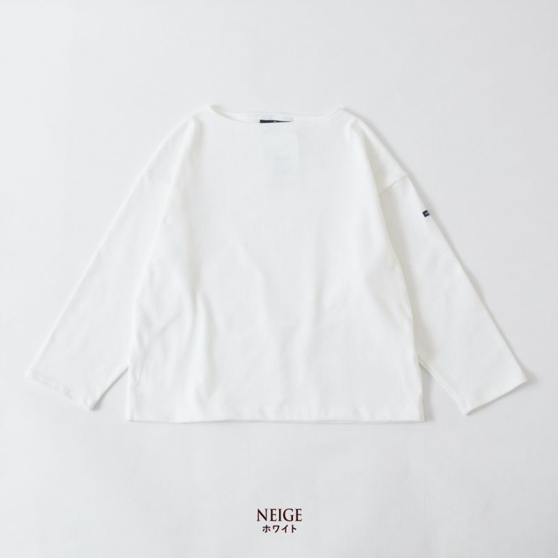 ボートネックや九分袖などキホンのディテールは定番ウエッソンと一緒。ドロップショルダーと裾のスリットを備えることでモダンなエッセンスをプラスしています。